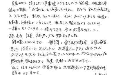 アルピーノ村 ギャラリー樟楠、銀花からのおたよりです 2025/11/27 今朝"樟楠"の庭は、柿の葉じゅうたんできれいでした。 冷たい風もなんのその。およそ2時間かかって、柿の葉あつめ。 70ℓの大袋にキツキツいっぱい押し込んで4袋も!重い!お疲れ様!でした。 今日は樟楠の日本茶の喫茶開店の日。抹茶を一服いただいて、元気百倍です。 賑やかに終了した伊集院真理子さんの土鍋展。搬出の時、彼女の言葉「…