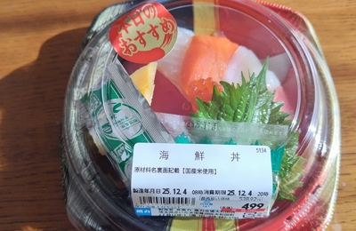 皮膚科の帰りにロヂャースへ寄ってbento少しだけ奮発して海鮮丼(^^♪ インスタント味噌汁と毎日飲んでる野菜ジュースを添えて