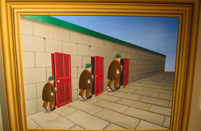ひとつの絵があります 奥に向かって人が大きくなって見えます そこで定規を当ててみます まず一番小さい手前の人 すっぽり入ります 2番目の人 これもすっぽりはいる 一番大きい人 なんとこれもすっぽり入ります 実は目の錯覚で皆同じ大きさなのです 女性が出口から出ようとして居ますが 付いて行ってみると 壁で頭を強打するだけです 階段がありますが これもトリックアートであります