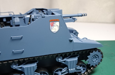セクストンⅡの塗装仕上げの続きです。校章マークは、作中車においては左右側面にみえますので、モデルカステンのガルパンデカールセットから2枚をとって貼りました。上図は右側面の1枚です。 作中車の右側面に校章マークが見えます。 そして左側面にも見えます。作中車のマークは左右対称に付けられているようです。 左側面にも貼りました。 最後につや消しクリアを薄く吹き付けて仕上げました。 かくして、完成品を塗装だ…