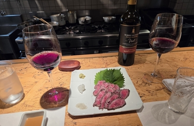 今夜のディナーは、篠田静夫著「ぶらり呑助舌つづみ*1」に紹介されていた「肉専科はふう」さんを予約済み。オーナーの実家が精肉卸業で和牛肉は折り紙付き、赤ワインに合う料理が豊富とのことだ。 すっかり暮れた京都中心部を、京都市役所から麩屋町通りを上っていき、夷川通りを越えたところにその店はあった。 12名ほど座れる長いカウンターと、奥に10名くらいは入れる部屋があるだけの小さな店。しかし京都の名店として…