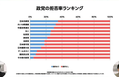 『選挙ドットコム』で【政党拒否率】が発表され、中道改革連合が第3位にランクインした。1位の共産党、2位のれいわ新選組に続く堂々の第3位である。グラフを見ると約30%の拒否率になる。第4位が「無し」だから、共産・れ新・中道は、拒否政党のBIG3だ。結党して数カ月の新党が、社民党を抑えて拒否政党の3位にランクインされるのは快挙といっていだろう。 政党拒否率とは政党支持率の反対で、「絶対に投票しない」政…