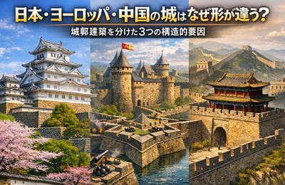 日本・ヨーロッパ・中国の城はなぜ形が違う?城郭建築を分けた3つの構造的要因 政治構造・軍事技術・地理条件が生んだ三つの「防御思想」の系譜 歴史旅行 | 主カテゴリ:歴史(因果・文脈理解) Chapter 1なぜ「城の形」を比較するのか──建築が語る文明の構造 姫路城の白い天守閣、ウェールズのカーナーヴォン城の巨大な円塔、北京を囲む明代の城壁。これらはいずれも「城」と呼ばれるが、その形態も規模も設計…