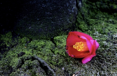 お茶の稽古で、客として点前を拝見していた時のことです。 不意に、床の間でバサッという大きな音がしました。驚いて目を向けると、椿の花が一輪、そのままの形で落ちています。居合わせた全員が思わず振り向くほどの音でした。落ちた花首は、こちらを睨み返しているかのようです。普段の楚々とした姿からは想像できない、激しい散り際でした。花には、それぞれ散り際の姿があります。椿は「落ちる」、桜は「散る」、梅は「こぼれ…