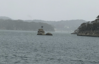 野暮用ついでに松島 何かやってたけどスルー 前に来た時は工事中だった橋 遊覧船に乗る 有名な島 おわかりだろうか? ニャー 内海から外海、そして内海に戻ると・・・ 急に吹雪いてきた どんどん溜まってく 視界もぼやけてくる 風情があったね