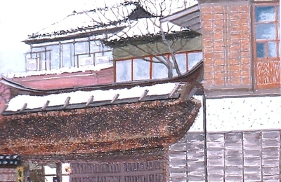 百年料亭「宇喜世」ランチのあとで ある年の、小雪の降る中を妻の誕生月とのことで、一緒にランチに伺いました。 おいしい食事の後で、外に出てみたら、けなげに、薄い白色の寒桜が咲いていました。 そしてこの構図が素敵でしたので取材をして、絵画作品に描いてみました。 3号の不透明水彩絵画作品です。 クリックして一つの画面にてお楽しみください。 冬空の中に、わずかに青色が混ざり 茅葺の北門が少し雪がかぶり、茅…