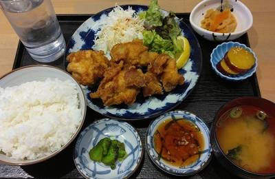 26/02/15 丸海屋@日本生命ビル(中央区) 若鶏のザンギ定食 1,200円 ご飯大盛り無料 ザンギは大きめのサイズが4個。お肉の質が良くて、やわらかくて外はカリッと揚がっていました。つけダレは甘酢タレ。 王道の札幌ザンギって感じです。 付け合わせのサラダに、小鉢が2つ、漬物、ごはん、味噌汁付きです。 量は満足でしたが、値段を考えるとザンギはもう1,2個ほしかったですね~。 テーブルの上には自…
