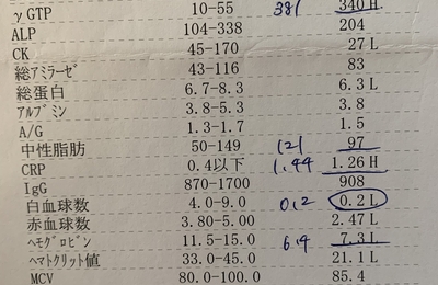 7月30日には白血球は0.2まで下がった。この頃くらいからだろうか、歯が痛み出してきた。白血球が低い状態で虫歯があっては感染の面でも危険なので、同じ病院の歯科の先生が病室まで来てくれて観てくれた。(私は病室から出られない為)幸い虫歯ではなかった。それと同時にこの頃くらいから、頬が腫れてきて口があまり開けられなくなった。ご飯を食べることも一苦労だ。血が止まりにくい状態の為、噛む時は口の中を噛まないよ…