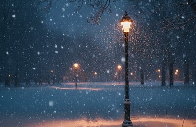 街灯の明かりに見えて降りしきる雪は静かに更に静かに
