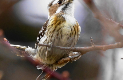 庭の梅の木にコゲラっちがやって来てギイーギイーと鳴きながら開花待ち(^^ゞまだ春遠く…の当地だけれど可愛い姿に癒されて♪♪ ふと見ると赤色羽がちらっと見えて可愛い男の子♂横顔もキュート 日本で一番小さな啄木鳥さん羽の模様もおしゃれだね(^^♪ ランキング参加中野鳥観察 ランキング参加中写真・カメラ