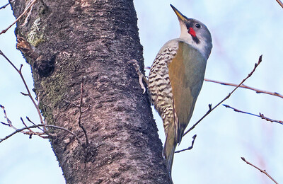 夕方5時近く、緑地のはずれは少し暗くなりかけた。 出会った知り合いと話をしていると、そこにアオゲラが静かに飛んできて、少しの間じっとしていた。知り合いは隣の木の穴から出てきたところを見たことがあるという。 いつも高い木の枝にいたり、声だけ聞こえるがどこにいるのか見えないことが多いのだが、ほんの10mくらいのところ。 実際には空抜けでシルエットにしか見えなかったが、写真の明度を上げるとこんな風になっ…