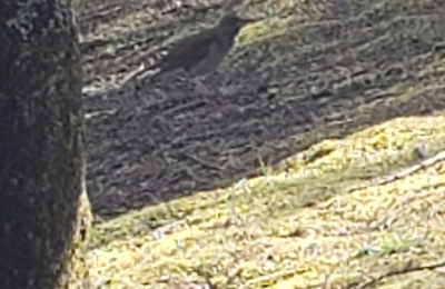 (春の気配) 朝からゴルフ練習場で ホーホケキョ 聞こえました。 練習場近くの公園に行ってみました。 鳴き声は聞こえるものの見つけられません。 遊歩道脇に何かいました。 【鳥の識別もむつかしい】 識別できません。写真では全くわかりませんね。 数分間留まってくれたので双眼鏡ではよく見えました。 でも識別できません。 【カメラ~】 Amazonさん早く送ってください