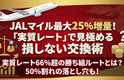 実質レート66%超えも!お得な交換ルートランキングと「損しない」ための基準について紹介します。 2025年に続き、JALマイルへの他社ポイントからの交換でのレートアップキャンペーンが2026年3月1日~3月31日の間で実施されます。 「最大25%増量」という数字だけを見ると、どのポイントから交換してもお得に見えますが、実はここに大きな落とし穴があります。 それは、「元のポイントの価値(1ポイント=…