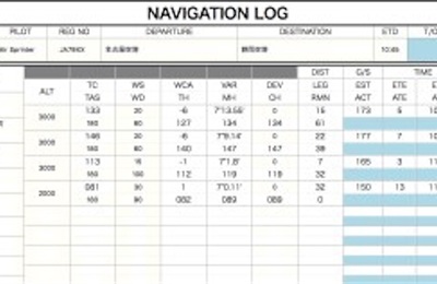 地図上のイメージでパイロットが自分で飛行ルートを決めてよいのだ。ただし、単発機のセスナではいざという時の不時着を考えて山間部上のルートよりも沿岸ルートを選ぶとよいのだそうだ。決めたルート上にいくつかの目標地点(チェックポイント)を設け、それぞれのチェックポイント間の高度や所要時間を一つの表に整理したのが「ナビゲーションログ」だ。ちなみにナビゲーションログに記載されている項目は下記の項目になる。 ①…
