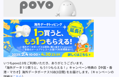 povoの1使うともう一個堪えるキャンペーンがありました。ただ、そんなに使わなかったので、持て余してしまいました。 データトッピングはpovo2で、povo1は海外データ定額。 量にもよりますが、多く使うなら海外データ定額の方がいいですが、もうpovo1はなく、するならAUに入るかなので、多くのデータなら、現地SIMカード買うのがいいのかな。 もはやモバイルWIFIは、なかなか広まらない感じですね…