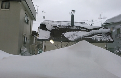 右側のベージュの壁が築39年の我が家である 除雪で庭に運び込んだ雪が3m位に達したのは 39年で初めてである