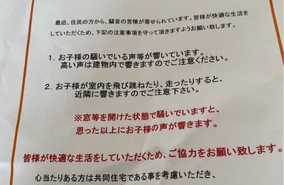 ついに来ました 恐れた事態が そう 【騒音注意のチラシ】 家はアパート 築3年 床にはクッション性が多少あるから足音は気になりませんよー っていうことに魅力に感じて1年前に引越してきた やっぱり子どもがいると 飛び跳ねたり騒いだりするから 多少工夫している家にしたんだけど やっぱり駄目でした👎 4世帯のアパートで子どもいるのは うちだけ 実質うちに対してのチラシ☠️ 声は警戒して窓を開けない生活に…