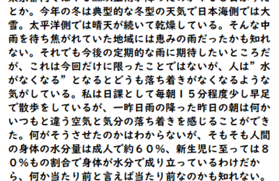 "ヒガパパ の”子どもの教育”に関する ”つぶやき” №1024" (テキスト版) 「人と水」 東京都内では10mm以上雨が降ったのが108日ぶりだとか。今年の冬は典型的な冬型の天気で日本海側では大雪。太平洋側では晴天が続いて乾燥している。そんな中雨を待ち焦がれていた地域には恵みの雨だったかも知れない。それでも今後の定期的な雨に期待したいところだが、これは今回だけに限ったことではないが、人は”水が…