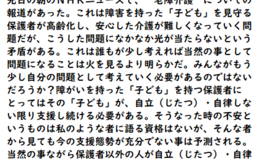 "ヒガパパ の”子どもの教育”に関する ”つぶやき” №968" (テキスト版) 「老障介護」 先日の朝のNHKニュースで、”老障介護”についての報道があった。これは障害を持った「子ども」を見守る保護者が高齢化し、安心した介護が難しくなっていく問題だが、こうした問題になかなか光が当たらないという矛盾がある。これは誰もが少し考えれば当然の事として問題になることは火を見るより明らかだ。みんながもう少し自分の問題として考えていく必要があるのではないだろうか?障がいを持った「子ども」を持つ保護者にとって…