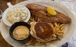 アメリカにだって、ベジタリアンやveganもいる。だから以下は「私らが行くレベルの店」の話だけれど、もう、食べ物に関しては日本が恋しくてたまらない。早く自分のキッチンで、日本の食材を使って料理したい。 姪夫婦とランチに行くとなると、その場でスマホを見て場所を決める。私はだだ付いていくしか能がない身なのであるが、↓ こんなメニューばっかだ。姪の夫のBill君が、決まり切ったものしか食べない男なので、選択肢がもともと狭いのもある。 私は「ナマズのフライ」を頼んだ。なぜか小パンケーキも2枚付いていた。…