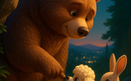 森に、ふわふわのトイプードルが迷い込んできました。首輪の鈴がチリンチリン鳴り、心細そうに震えています。 リスのリッキーはすぐに高い木へ駆け登り、街の光を見つけました。まるでUFOのように瞬く車のライトを指さし、「ボクのしっぽについてきて!あの光がキミのお家だよ」と声をかけます。 ウサギのウーちゃんは耳をピンと立て、風に乗って届く「プーちゃーん」という飼い主の声をキャッチ。「シーッ、聞こえる? あの優しい声、キミを呼んでるよ。」と囁きます。 最後の難関は川。クマのクーちゃんがゆっくり近づき、「しっ…