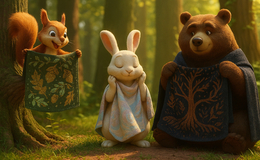 リスのリッキー、ウサギのウーちゃん、クマのクーちゃんは、織物を披露しました。 リッキーの「速乾・軽量・多機能ポケット帯」。枝から枝へ軽やかに跳びながら、誇らしげに帯を広げます。帯には葉っぱやどんぐりを幾何学模様にしたカモフラージュ柄が織り込まれ、モスグリーンにメタリック糸がきらりと光ります。風通織の二重構造で通気性も抜群。「森を駆け回るのにぴったり」。 ウーちゃんの「月明かりのショール」。ふわりと肩にかけたショールは、淡いパステルカラーに月白が重なり、光沢のある朱珍織が月光のようにきらめきます。…
